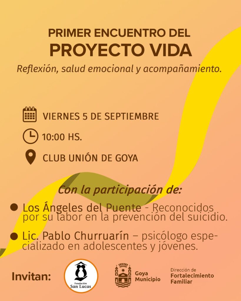 La Dirección de Fortalecimiento Familiar, dependiente de la Secretaría de Desarrollo Humano de la Municipalidad de Goya, junto a la Fundación San Lucas de nuestra ciudad, invitan a escuelas, clubes deportivos, instituciones religiosas y a la comunidad en general a participar del Primer Encuentro del “Proyecto Vida”, un espacio creado para reflexionar, promover la salud emocional y acompañar en situaciones de vulnerabilidad, fortaleciendo la esperanza y el cuidado de la vida.