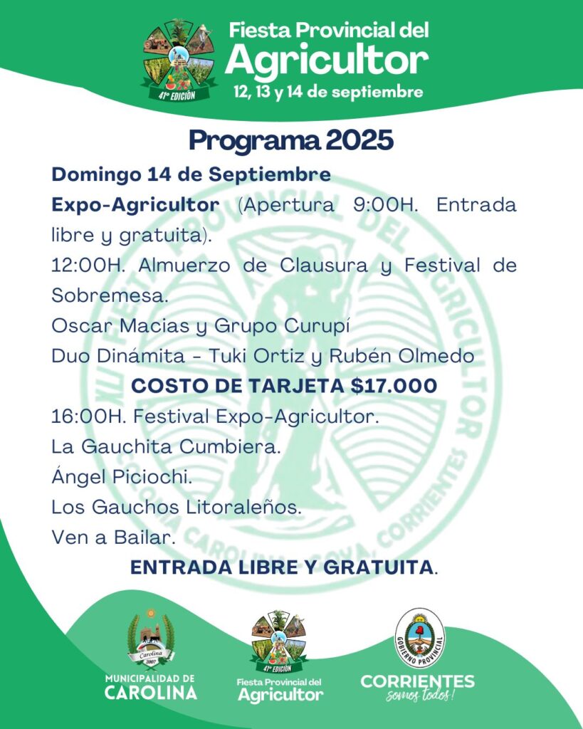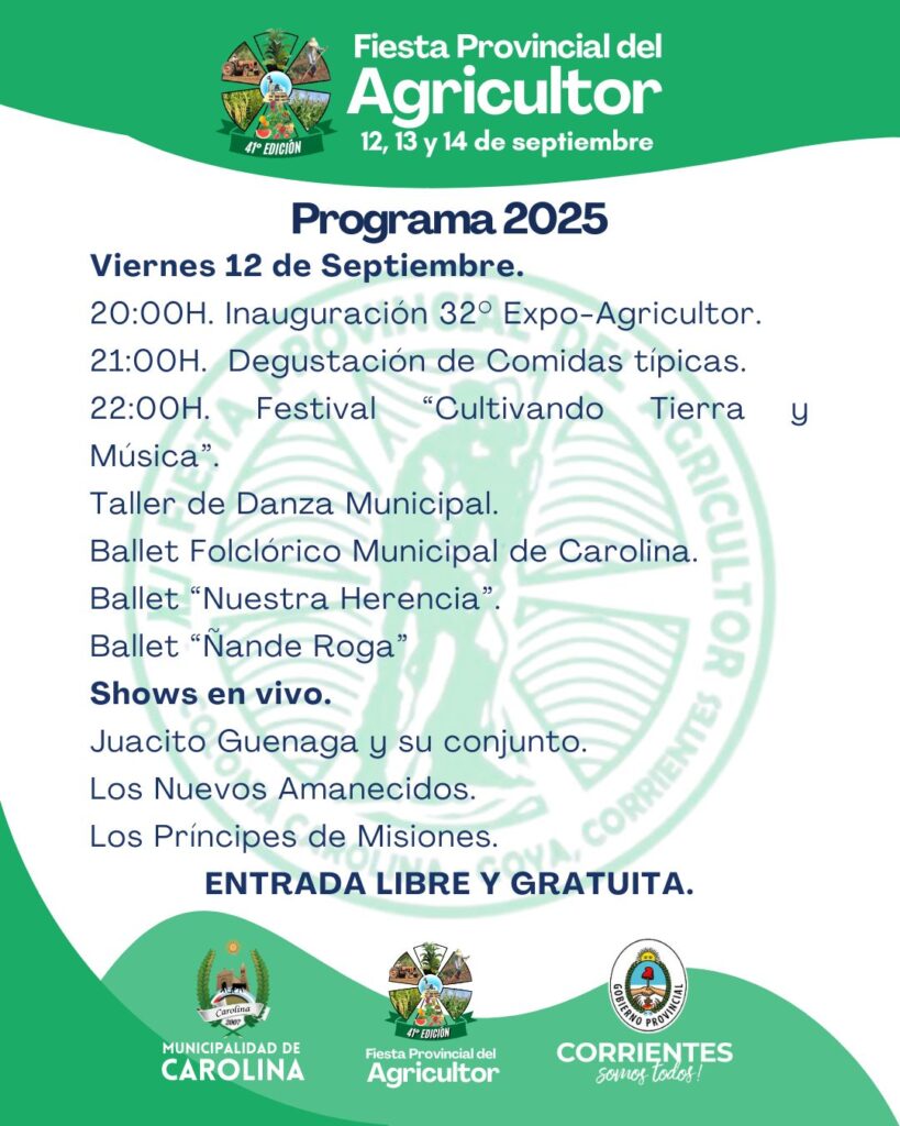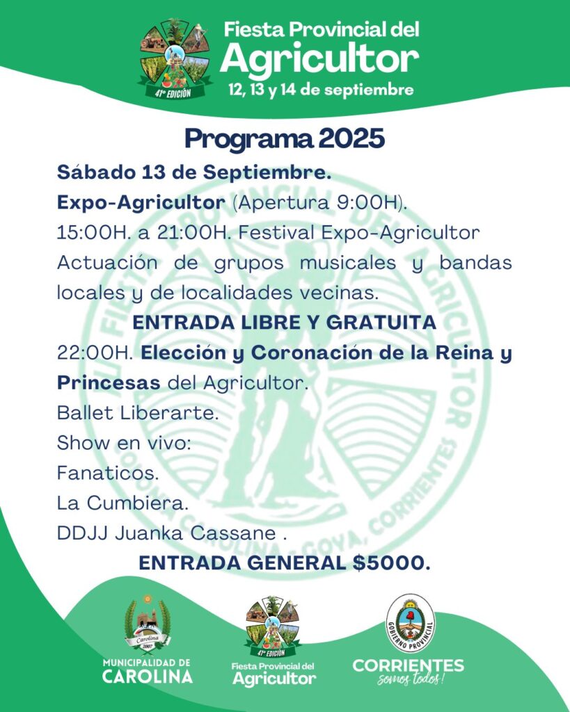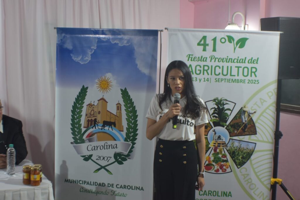 Carolina realizó la presentación oficial de la 41ª edición de la Fiesta Provincial del Agricultor, con la presencia del intendente Elvio Sanabria, autoridades municipales, la nueva electa intendente Andrea Larcón, la representante de la Policía de Carolina, las autoridades de la Comisión del Agricultor, la reina y la primera y segunda princesa de la fiesta, y las postulantes al reinado, junto a demás referentes locales. Durante el acto se presentó el programa de actividades: el viernes 12 de septiembre, a partir de las 20:00, se llevará a cabo la inauguración de la 32ª Expo Agricultor; tras la apertura, las autoridades realizarán una recorrida por el predio y los stands participantes.