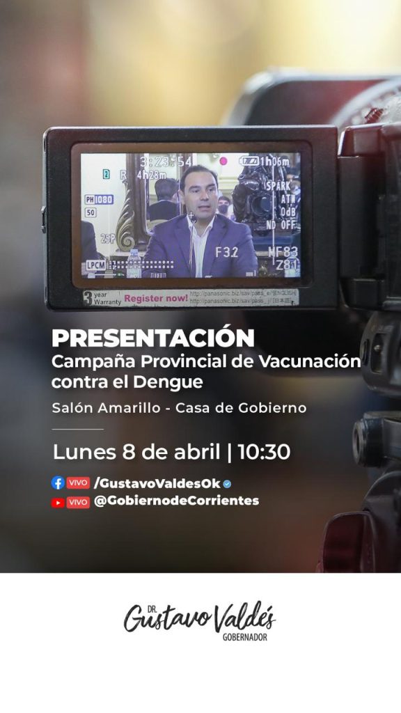 El gobernador Gustavo Valdés este lunes a las 10.30 en el Salón Amarillo de Casa de Gobierno realizará el lanzamiento de la Campaña provincial de vacunación contra el Dengue.